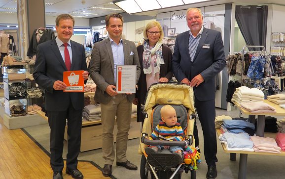 Bei Müller shoppt man generationenfreundlich V.l. Peter Reichert, Swen Rubel, Sigrid Müller-Götz und Dietrich Müller mit Enkel Luka. (Foto: Claudia Richter)(cr) Mit einem Zertifikat vom Handelsverband Nordbaden wurde gestern das Eberbacher Modehaus Müller ausgezeichnet. Der Geschäftsführer des Verbandes, Swen Rubel, konnte somit dem ersten Betrieb in Eberbachs Innenstadt die Qualitätsauszeichnung "Generationenfreundliches Einkaufen" überreichen.