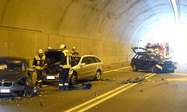 Auto außer Kontrolle - sieben Verletzte (Foto: Feuerwehr)(tom) Schwerer Unfall im Hirschhorner Tunnel mit sieben Verletzten und drei beteiligten Autos: Die Rettungsdienste waren am heutigen Sonntagnachmittag mit einem Großaufgebot vorort.