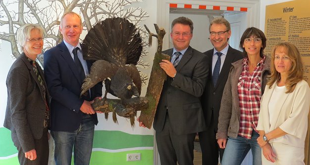 Eigentlich schon immer sei der ausgestopfte Auerhahn Bestandteil der Biologiesammlung am HSG, so Lehrerin Edit Spielmann, die für die Sammlung zuständig ist. Aber so wirklich als Anschauungs- und Lehrobjekt diente das balzende Tier scheinbar doch nicht. Deshalb nutzte heute Spielmann mit HSG-Rektorin Anja Katzner die Jahreshauptversammlung der AG Naturparke Baden-Württemberg, zu der Dr. Achim Brötel, Landrat des Neckar-Odenwald-Kreises und Sprecher der AG, nach Eberbach eingeladen hatte. Zu der Versammlung kamen unter anderem auch der Landrat des Landkreises Rastatt, Jürgen Bäuerle, als Vorsitzender des Naturparks Schwarzwald Mitte/Nord und der Geschäftsführer Karl-Heinz Dunker. Ihnen wurde im Beisein von Brötel und der Geschäftsführerin des Naturparks Neckartal-Odenwald, Cordula Samuleit, der präparierte balzende Vogel übergeben.