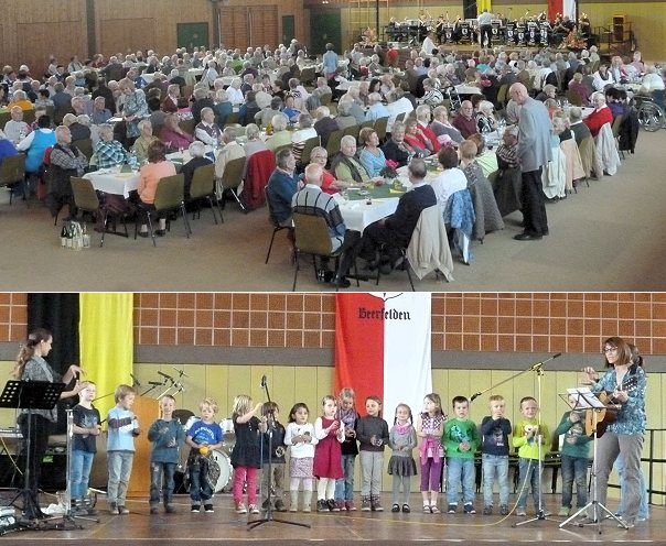 Wolfgang Hörr sorgte in bewährter Weise mit beschwingten Orgelklängen für Unterhaltung, war aber auch gleichzeitig zweimal als Dirigent aktiv. Zuerst jedoch unterhielten die Kinder der Kindertagesstätte Abenteuerland und ihre Erzieherinnen mit zwei Herbstliedern das Publikum, und so manch einer wird seinen Groß- oder Urgroßenkel unter den jungen Sängerinnen und Sängern entdeckt haben. Im weiteren Verlauf des Nachmittags unterhielt der Gemischte Chor des Odenwälder Volkskunstkreises Beerfelden die Senioren, und spätestens beim Volkslied „Tief im Odenwald“ wurde eifrig mitgesungen. Den Abschluss des Programmes bildete zünftige Blasmusik, dargeboten von der Feuerwehrkapelle Beerfelden.