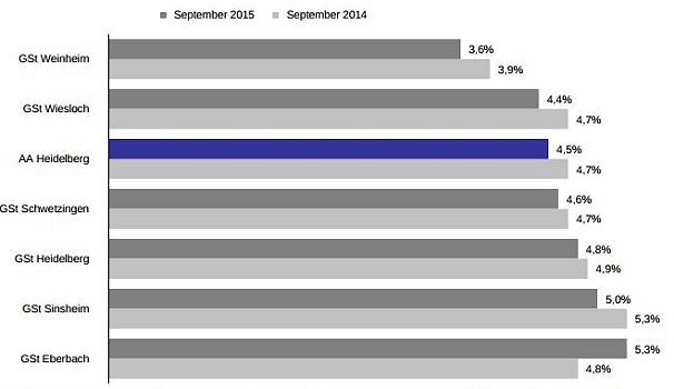 Saisonale Effekte auf dem Arbeitsmarkt spürbar  Arbeitslosenquoten im September. (Grafik: Bundesagentur für Arbeit)(bro) (aa) Die Zahl der arbeitslosen Menschen im Heidelberger Agenturbezirk ist von August auf September um 548 auf 16.275 Personen gesunken. Gegenüber dem Vorjahresmonat ist die Arbeitslosigkeit jetzt um 445 niedriger. Die Arbeitslosenquote ist um 0,1 zurückgegangen und beträgt jetzt 4,5 Prozent.