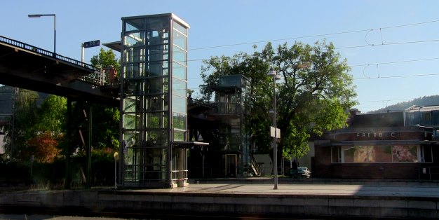 Zusätzlicher Treppenabgang am mittleren Aufzug geplant (Foto: Hubert Richter)(hr) Der Fußgängersteg am Bahnhof Eberbach ist sanierungsbedürftig. Der Gemeinderat legte sich heute unter den vorgestellten möglichen Varianten einstimmig auf eine Komplettinstandsetzung einschließlich Belagserneuerung fest.