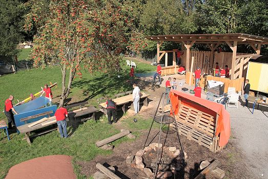 als geplant. (Foto: Adler-Witkowski)(bro) (mw) Reines Staunen war es: „Die hören einfach nicht auf“, bemerkte nicht nur Tanja Bauer, Ehrenamtskoordinatorin der Johannes-Diakonie. Das Lob galt kürzlich 38 Audi-Mitarbeitern aus Ingolstadt. Sie hatten bei einer Freiwilligenaktion für die Outdoor-Klasse der Schwarzbach Schule sechs Projekte umgesetzt und darüber hinaus weitere kleine Baustellen auf der Jugendfarm Schwarzach der Johannes-Diakonie beseitigt - eine Win-win-Situation für alle Beteiligten.