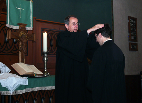 Gemeinde und Pfarrer auf Probe Dekan Folkhard Krall (li.) segnet Pfarrer Jonathan Richter. (Foto: Hofherr)(hof) Als im vergangenen Jahr mit Pfarrer Andreas Reibold der evangelische Seelsorger der Kirchengemeinden Strümpfelbrunn und Waldkatzenbach nach Karlsruhe verabschiedet wurde, machten die die evangelischen Christen auf dem Winterhauch auf eine längere Vakanz gefasst. Als es auch nach einer zweiten Ausschreibung keine Bewerbung gab, machte sich Ernüchterung breit, weshalb das Angebot, mit Jonathan Richter für zwei Jahre einen Pfarrer auf Probe nach Waldbrunn zu entsenden, wie ein „Geschenk des Himmels“ aufgenommen wurde, berichteten die Vertreter der Pfarrgemeinderäte Christian Starck (Waldkatzenbach) und Andreas Steck (Strümpfelbrunn) beim Begrüßungsempfang nach dem feierlichen Vorstellungsgottesdienst mit Abendmahl in der Kirche. Dort hatte Pfarrer Jonathan Richter mit Gläubigen aus ganz Waldbrunn, den Kirchenchören aus beiden Gemeinden sowie dem Singkreis, nicht nur Erntedank gefeiert, sondern war gleichzeitig von Dekan Folkhard Krall gesegnet worden. Damit nahm Jonathan Richter nun auch offiziell seinen Dienst auf dem Winterhauch auf, wo er schon seit 01. September 2015 wirkt. Als Pfarrer auf Probe wirke Richter zunächst für zwei Jahre in Strümpfelbrunn, Mülben, Weisbach und Waldkatzenbach. Um sich nach und nach den Aufgaben eines Pfarrers zu stellen, übernehme Jonathan Richter zunächst „nur“ seelsorgerische Aufgaben wie Gottesdienste, Anleitung kirchlicher Gruppen und den Religionsunterricht. Für administrative Aufgaben stehen im erfahrene Kollegen zur Seite, erfuhren die versammelten Gemeinde von Dekan Krall.