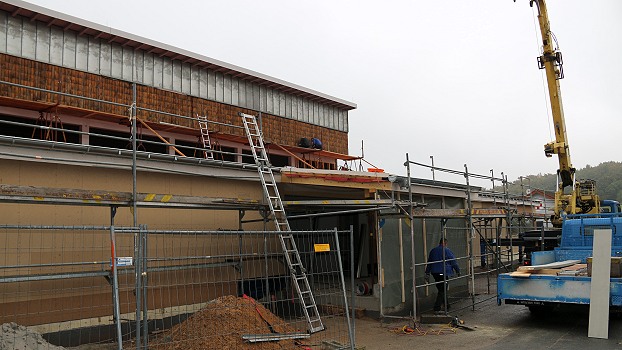 Die generellen Sanierungs- und Verbesserungsarbeiten laufen schon seit einigen Jahren, berichtete Keursten im Gespräch. Zuerst wurde das Dach erneuert und verstärkt, danach bekam die Glasfront Richtung Westen ein anderes Aussehen. Jetzt ist nach den Worten des Bürgermeisters der komplette Sanitär-, Eingangs- und Umkleidebereich Richtung Osten an der Reihe. Dieser werde zum einen modernisiert, zum anderen ausgedehnt. Der komplette Bereich wird auf die Flucht des bisherigen Eingangs nach außen gezogen. So entstünden insgesamt 300 Quadratmeter Fläche.