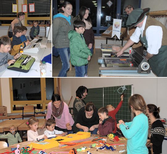 Ein Schwerpunkt des Abends waren - passend zur Familienbibliothek Bücherkiste - Erfindungen rund um die Themen Bücher, Lesen und Schreiben. Mit dabei war die Druckwerkstatt Mosbach e.V., die in historischen Kostümen die Anfänge der revolutionären Erfindung des Buchdrucks in Vorführungen zeigte und die Gelegenheit zur Herstellung eigener Drucke bot.