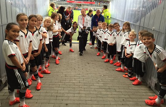 Vorausgegangen war eine überzeugende Bewerbung eines VfB-Trainers an den Deutschen Fußballbund. Die Mädchen und Jungen im Alter zwischen vier und sieben Jahren waren begeistert. Sie wurden mit Schuhen und Trikots ausgestattet, durften mit den Spielerinnen die Nationalhymne singen und den Zuschauern zuwinken.