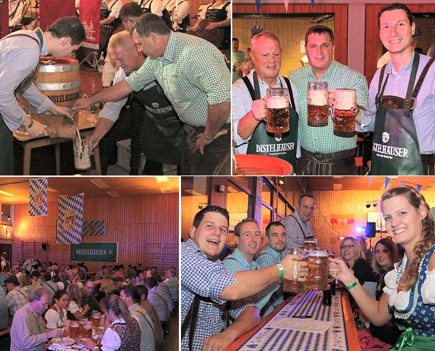 Die weiß-blaue Fahne wehte am Neckar (Fotos: Thomas Wilken)(tom) Ruckzuck floss am vergangenen Wochenende der Gerstensaft in Strömen: Bürgermeister Norman Link hatte beim Fassbieranstich keine Probleme, mit wenigen gezielten Hammerschlägen das Bier zur Abfüllung in die Krüge bereit zu machen. Seine Aktion bedeutete den offiziellen Auftakt für das zweite Oktoberfest des SV Zwingenberg. Die Peter-Kirchesch-Halle erstrahlte zu diesem Zweck komplett in weiß-blau. Fahnen an der Decke, eine entsprechende Dekoration und natürlich Trachten ohne Ende machten die Illusion von Bayern am Neckar glaubhaft.