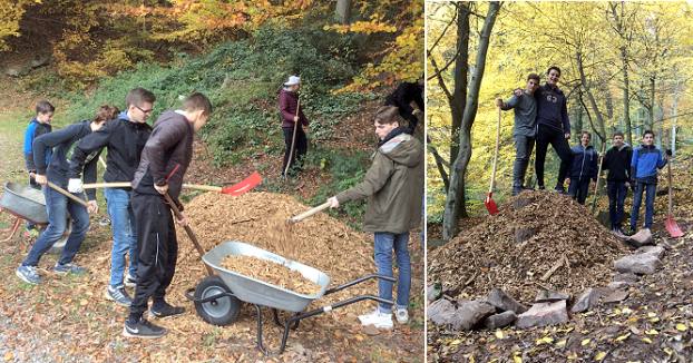 Nachdem das Schuljahr wieder begonnen hatte, konnten die Schüler am Bau weiter arbeiten. Die NwT-Gruppe der Klassen 10 a/b brach am Freitag, 30. Oktober, mit Schubkarren und Schaufeln bewaffnet auf, um hinter dem Arboretum den Meiler zu Ende zu bauen. Sie mussten nun die Stämme mit Hackschnitzel zudecken, damit diese besser verrotten können. Damit die Stimmung gut blieb, gab es Kuchen, Butterbretzel und heißen Tee.