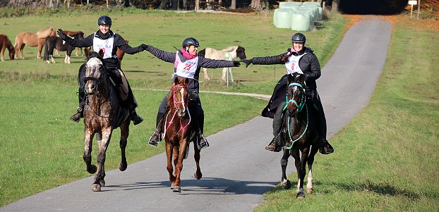 Auf 35 Kilometer ging der Ritt rund um Rothenberg (Foto: Thomas Wilken)(tom) Besser hätte der Abschluss für die Distanzreiter nicht sein können. Bei der Zielankunft des ersten „Halloween-Distanzritts“ rund um Rothenberg wurden sie auf der Höhe bei der Sporthalle von der Sonne verwöhnt. Morgens, beim Start auf die 35 Kilometer lange Strecke, hatte noch tristes Grau vorgeherrscht. Die 24 Paare, Pferd und Reiter/in, hatten eine anspruchsvolle Doppelschleife mit 800 Höhenmetern zwischen Hainbrunn, Kortelshütte und Beerfelden zu bewältigen.