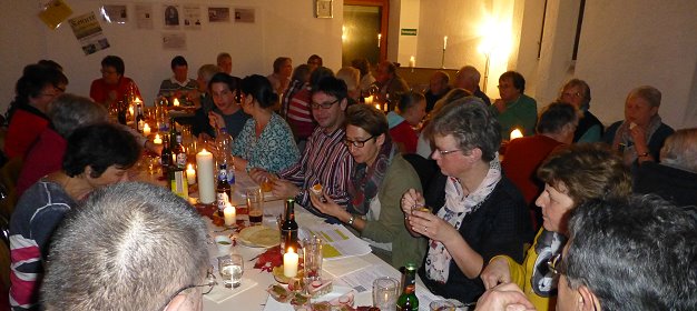 Ein kulinarischer und geistiger Besuch bei Luther Gut schmecken ließen es sich die zahlreichen Gäste beim gemeinsamen Mahl am Reformationstag in Allemühl. (Foto: Markus Wäsch)(hr) (maw)Deftiges, aber auch Geistreiches bekamen die über 40 Besucherinnen und Besucher am Reformationstag im Gemeinderaum der Allemühler Kirche serviert. Eingeladen hatte die evangelische Kirchengemeinde Schönbrunn zu einem ganz besonderen Gemeindeabend auf Martin Luthers Spuren unter dem Motto „Nahrhaft-deftig-Gnade“.