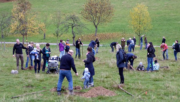 Zweite Obstbaumpflanzung auf dem Breitenstein (Foto: privat)(bro) (chk) Am frühen Samstagmorgen, 7. November, setzten sich viele junge Familien mit einen Spaten im Gepäck vom Parkplatz auf dem Breitenstein in Bewegung. Ziel war das NABU-Grundstück nahe der Margareta-Steinmetz-Eiche, das seit 2014 offiziell „Geburtsbaumgarten“ heißt, denn dort war wieder eine Geburtsbaum-Pflanzaktion angesagt.