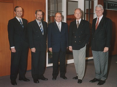 Fusionspartner sind sich ans Herz gewachsen Zufrieden mit dem Geschäftsjahr 2001: die Vorstandsmitglieder Ekkehard Saueressig, Friedrich Heuser, Günter Michel, Herbert Hinterschitt und Wilfried Herbold (v.l.). (Foto:Volksbank)(hr) Eine durchweg positive Bilanz des abgelaufenen Geschäftsjahres zog der Vorstand der Volksbank Neckartal gestern im Rahmen einer Pressekonferenz. Vorstandsvorsitzender Herbert Hinterschitt sprach angesichts der reibungslos verlaufenen Fusion der Volksbank Eberbach-Hessisches Neckartal mit der Volksbank Neckargemünd-Meckesheim nicht nur von einer Geldheirat der beiden Institute, sondern im Hinblick auf die gegenseitigen Sympathien fast schon von einer "Liebesheirat". Auf jeden Fall ist die Bankenehe gleichgeschlechtlich, denn Strukturen und Geschäftsvolumen der beiden Häuser waren ähnlich.