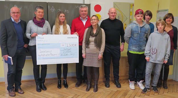 Seit etwa acht Jahren spenden bundesweit Mitarbeiterinnen und Mitarbeiter der Daimler AG die Cent-Beträge, die bei der Entgelt-Abrechnung hinter dem Komma stehen. Inzwischen beteiligten sich bis zu 90 Prozent der Belegschaft an dieser Aktion "Daimler ProCent", so Jutta Traxler, Betriebsratsvorsitzende von Mercedes-Benz Mannheim-Heidelberg-Landau, ihr Stellvertreter Bernhard Sauer und Kollegin Kim Bixner. Daimler selbst verdoppelt den von seinen Mitarbeitern gespendeten Betrag, und so können in ganz Deutschland zahlreiche soziale Projekte gefördert werden. Wer in den Genuss der Förderung kommt, liegt im Ermessen des firmeninternen Entscheiderkreises, der sich unter anderem aus Mitgliedern des Gesamtbetriebsrats und der Unternehmensleitung zusammensetzt und daran, ob das Projekt den Förderrichtlinien entspricht. So muss beispielsweise der Empfänger der Geldspende gemeinnützig sein.