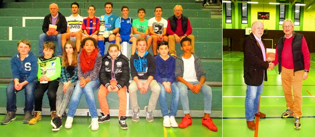 Weihnachtsturnier an der Werkrealschule Links: Die Siegermannschaften. Rechts: Der kommissarische Schulleiter Richard Wurm (re.) überreichte dem ehemaligen Kollegen Franz Runkel das Geld für Indonesien. (Foto: privat)(bro) (mf) Auch in diesem Jahr fand in der Werkrealschule Eberbach ein Weihnachts-Fußballturnier statt.