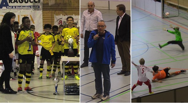 Neuzugang Borussia Dortmund sichert sich in den letzten Sekunden den Sieg Links Elena Ragucci bei der Siegerehrung. Mitte Antonio Ragucci, Tobias Soldner und Bürgermeister Peter Reichert (v.l.) bei der Begrüßung, rechts eine Spielszene. (Fotos: Patricia Trinkaus / Hubert Richter)(pt) Gestern richtete der VfB Eberbach zum vierten Mal den „Ragucci U12 Hallencup“ aus. Bei dem erstklassigen Jugendfußballturnier traten in diesem Jahr wieder 16 Jugendmannschaften, darunter viele Bundesligavereine, gegeneinander an.