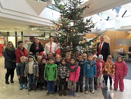 Die Kindergartenkinder und die Erzieherinnen wurden von Regionaldirektor Karlheinz Emig begrüßt. Mit viel Freude dekorierten die Kinder den Weihnachtsbaum mit ihrem selbst gebastelten Christbaumschmuck.