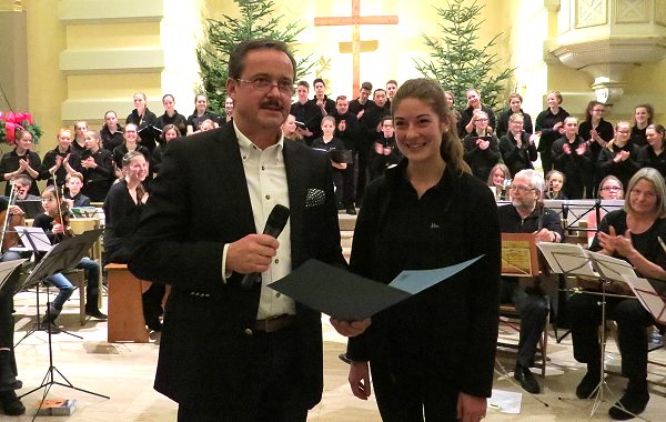 Völlig überrascht wurde heute die Eberbacherin Magdalena Plagge während des traditionellen Adventsliedersingens der Musikschule in der evangelischen Michaelskirche mit der Überreichung des Kulturpreises 2015 der Bürgerstiftung Eberbach. Frieder Reichert, Vorstandsmitglied der Bürgerstiftung, verkündete während der Veranstaltung, dass unter den anwesenden Musikerinnen und Musikern der oder die Kandidatin für den diesjährigen Kulturpreis sei. "Weiblich, seit dem Jahr 2003 Unterricht für Klavier, Klarinette und Orgel an der Musikschule Eberbach, seit 2004 Sängerin bei den Spatzen- und Jugendchören, später bei Voices of Heaven, ab 2007 in diversen Ensembles an der Musikschule" waren nur einige Eckdaten, die Reichert ohne Namensnennung verriet. Aber spätestens bei der Information "Mitglied bei der jungen Philharmonie Neckartal-Odenwald, beim Symphonischen Blasorchester Neckartal und Orgeldienst in der evangelischen Michaelskirche", wurde Magdalena Plagge klar, dass sie mit diesem Preis ausgezeichnet wird.