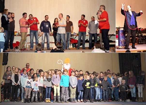 Der Nikolaus hatte im Laufe des Jahres einiges beobachtet und ließ die einzelnen Jugendmannschaften, beginnend mit den kleinsten Bambini bis hin zu den D-Junioren/-innen, vortreten. Ihm gefiele es, wenn die Kleinsten in der Bambinigruppe spielten, und so motivierte er sie, dabeizubleiben. Bei den F-Junioren sah er noch Potential zur Weiterentwicklung. Bei den E-Junioren/-innen hob er den deutlichen Aufwärtstrend hervor. Dieser wurde bei den beiden E-Junioren Mannschaften ohne Punktverlust mit den Herbstmeisterschaften gekrönt. Die E-Juniorinnen beendeten ihre Runde als sehr gute Dritte. Für die D-Junioren/-innen hatte er aufmunternde Worte, etwas mehr Engagement beim Training könne nicht schaden. Nach einem gemeinsamen Gruppenfoto wurde die Bühne von den Eltern und Spielern regelrecht gestürmt. Sie wollten sich bei den Trainern und Betreuern bedanken. Die Geschenke wurden mit einem schönen Spruch, Gedicht oder Lied überreicht.