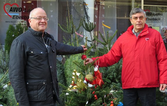 Dietmar Lamprecht, Präsident der Eberbacher Lions (links im Bild), übergab am Dienstag 16 zum Teil bereits geschmückte Weihnachtsbäume an den Vorsitzenden der AWO Eberbach, Gustel Mechler. Vor allem bei alleinerziehenden Müttern sollen die Bäume während der kommenden Festtage die Wohnzimmer und Gabentische zieren.