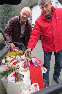 Der Eberbacher AWO-Vorsitzende Gustel Mechler und Ehrenvorsitzender Günther Ihrig waren mit einem vollgepackten Pkw auf Tour. Im Kofferraum befanden sich 40 Taschen mit Geschenken, vor allem Lebensmittel und Produkte des täglichen Bedarfs. Die Adressaten der beiden “guten Geister” waren Menschen in Eberbach, bei denen Geld Mangelware ist und die auf diesem Wege eine kleine Unterstützung und Freude zu Weihnachten geschenkt bekamen. Weil häufig alleinerziehende Frauen darunter sind, hatten Ihrig und Mechler zusätzlich auch Päckchen mit Spielsachen und anderen Kinderprodukten dabei, die von privater Seite dafür gespendet wurden.