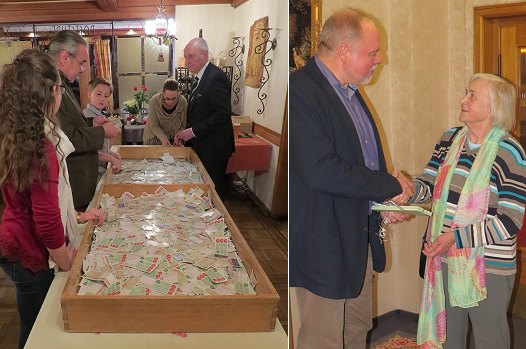 Sachpreise und Gutscheine im Wert von über 4.000 Euro Links die Ziehung der Gewinner, rechts Hauptgewinnerin Ruth Skapa mit dem EWG-Vorsitzenden Dietrich Müller. (Fotos: Hubert Richter)(hr) Mit der Ziehung der Gewinner fand heute Abend im Hotel Krone-Post die diesjährige Weihnachtsverlosung der Eberbacher Werbegemeinschaft (EWG) ihren Höhepunkt.