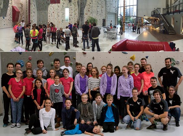 Eine andere Gruppe durfte zum Bouldern. In der Halle gibt es einen Boulderbereich, wo man ohne Sicherung an den Wänden klettern darf. Damit sich niemand verletzt, ist der komplette Boden mit Weichbodenmatten ausgelegt.