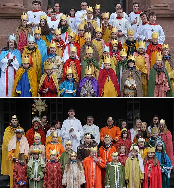 In der Pfarrgemeinde St. Johannes Nepomuk wurden in einem Wortgottesdienst 37 Sternsinger durch Diakon Szendzielorz gesegnet und ausgesandt und machten sich in acht Gruppen auf den Weg (unser Bild oben). Vorher gab es zur Stärkung noch ein gemeinsames Mittagessen. Ein gemeinsames Mittagessen gab es auch in St. Josef bevor sich die 30 Sternsinger von dort in ebenfalls 8 Gruppen auf den Weg machten. Den Aussendungsgottesdienst hatte Pfarrer Matthias Stößer zusammen mit den Sternsingern gestaltet.