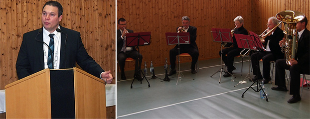 Flüchtlinge sind Chance für Winterhauch-Dörfer In seiner Neujahrsansprache hob Bürgermeister Markus Haas hervor, dass man die Flüchtlingsfrage trotz aller Schwierigkeiten als Chance für den Ländlichen Raum begreifen müsse. Musikalisch umrahmt wurde der traditionelle Neujahrsempfang vom Bläserquintett Hoher Odenwald. (Fotos: Hofherr)(hof) Mit einem positiven Rückblick und einem hoffnungsvollen Ausblick begrüßte Bürgermeister Markus Haas am Dreikönigstag das neue Jahr. Zum traditionellen Neujahrsempfang, den wie immer die Sternsinger der Pfarrgemeinde St. Maria eröffneten, durfte das Gemeindeoberhaupt nicht nur viele Bürger in der Winterhauch-Halle begrüßen, mit Ehrenbürger Gerd Mosca, den Landtagsabgeordneten Peter Hauk (CDU) und Georg Nelius (SPD), Landrat Dr. Achim Brötel und Alt-Bürgermeister Klaus Schölch sowie Bürgermeister der Nachbargemeinden bzw. –städte und Vertreter der Wirtschaft, der Schulen, der Vereine und sonstiger Institutionen, waren auch viele Ehrengäste der Einladung gefolgt.