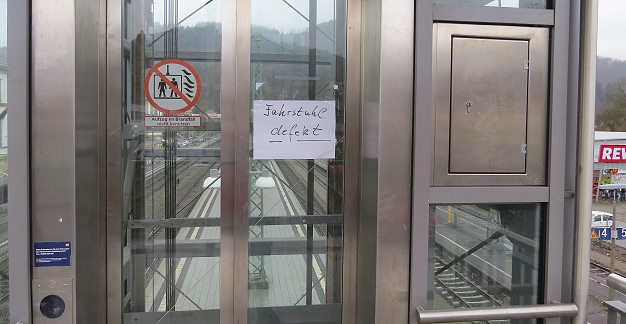Ende September 2015 wurde der Lift, der Personen zu den Gleisen 2 und 3 bringt, nach einem technischen Defekt gesperrt. Die Folge war monatelang eine für viele Fahrgäste der Deutschen Bundesbahn unangenehme - für einige sogar unlösbare - Herausforderung, denn es gibt keine barrierefreie Alternative, zu den Gleisen 2 und 3 zu gelangen. Die Herstellerfirma hatte Probleme, die passenden Ersatzteile zu besorgen, weshalb die Reparatur sehr lange auf sich warten ließ.