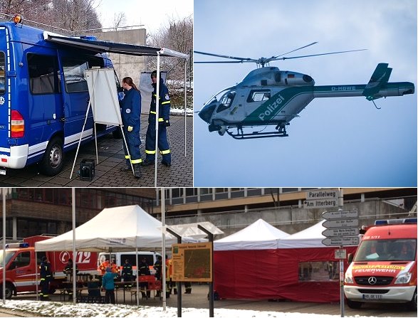 Eine intensive Suchaktion der Polizei mithilfe eines Spezialhelikopters (Bild oben rechts) und mit Unterstützung der Eberbacher Hilfsorganisationen Feuerwehr, THW und DRK am Sonntag im Waldgebiet nördlich von Eberbach auf einer Fläche von rund 1,3 Quadratkilometern blieb ohne Erfolg und erbrachte keine weiteren Hinweise.