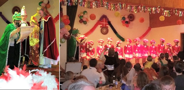 Dann stand dem bunten Treiben nichts mehr im Wege und dem Publikum aus großen und kleinen Gästen wurde ein abwechslungsreiches Programm geboten. Zahlreiche lustige Spiele hielten die große Narrenschar auf Trab. Um die Wette wurden lange Rapunzelzöpfe geflochten, “Frau-Holle-Schneeflocken“ gepustet und die Guten ins Töpfchen und die Schlechten ins Kröpfchen befördert. Außerdem kämpften die verkleideten Kinder um Plätze bei der „Reise in den Märchenwald“. Zur Freude aller Kinder lieferten sich aber auch die großen Gäste den einen oder anderen Wettstreit. Zwei Mama-Teams traten beim Märchenraten gegeneinander an und drei Väter schlüpften in die Rolle des Rumpelstilzchens, tanzten um ein vermeintliches Lagerfeuer und sangen das berühmte Lied des kleinen Trolls. Das Applausbarometer des Publikums ernannte schließlich Frank Leutz zum besten Rumpelstilzchen.