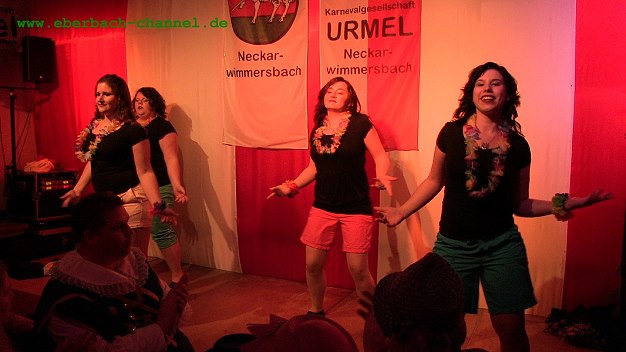 Ein fast fünfstündiges buntes Programm boten die Aktiven der KG Urmel nach dem Einmarsch des Elferrats und der Begrüßung durch Präsident Joachim Schwab mit Büttenreden von "Kalle und Renate" (Karl Beisel und Renate Konradi), Petronella (Heide Baier), Sandy und Chantalle (Marilena Messel und Maj Sue Lack), den Schwestern Grimm (Melly Wettig und Jamila Strangfeld) und einem Messdiener (Christian Nahm), der im Auftrag des Herrn unterwegs war sowie flotten Tanzdarbietungen in fröhlichen Kostümen von den Urmelminis, Urmel Teens, Get Freaky, Apollo Urmel Crew, Urmelinchen Samira Schmidt, Young Urmels und den "Ugly dancing DiscoBoys from the 90's”. Christian Nahm und Bernhard “Lungo” Walter verlasen die unvermeidlich peinlichen “Urmel News”.