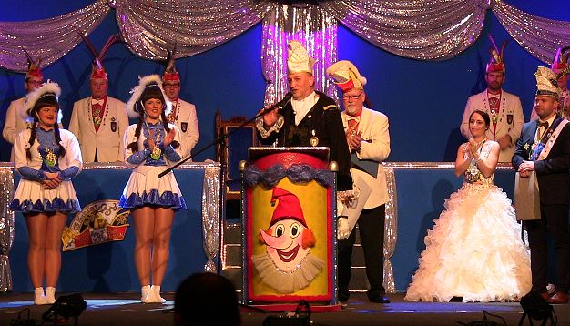 Im Polizeichef einen Freund der Eberbacher Fastnacht gefunden Der neue Ehrensenator Erich Lindenthal bei seiner Dankesrede, rechts hinter ihm Ehrenpräsident Dieter Müller. (Foto: Hubert Richter)(hr) Im Rahmen der gestrigen dritten Prunksitzung der Karnevalgesellschaft Kuckuck in der Eberbacher Stadthalle wurde ein neuer Ehrensenator ernannt.