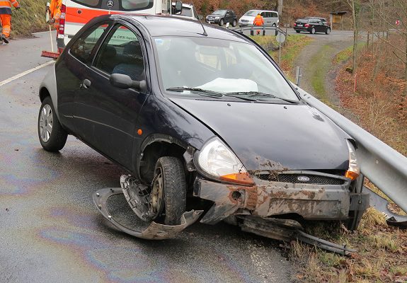 Gegen Böschung und in Leitplanken geprallt (Foto: Hubert Richter)(hr) Zwei Leichtverletzte und einen Totalschaden forderte heute kurz nach Mittag ein Unfall auf der L 524 zwischen Unterdielbach und Eberbach.