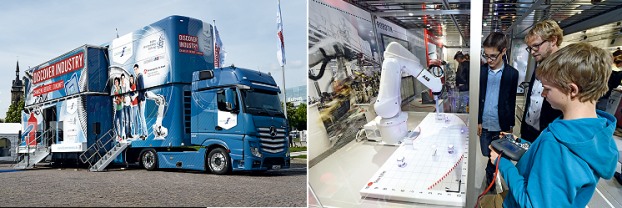 Im Inneren des auffälligen Ausstellungsfahrzeugs gewinnen die Jugendlichen praktische Einblicke in das Denken und Arbeiten von Ingenieuren und anderen Fachkräften: Zu Beginn des Workshops gehen sie an einem multimedialen Touchtable gemeinsam mit den beiden Ingenieuren Dr. Peter Hörtz und Nikolaus Bauer auf Streifzug durch die Geschichte der industriellen Entwicklung. Videoclips, Soundfiles und interaktive Elemente veranschaulichen, wie der gesellschaftliche und technische Fortschritt im Laufe der Zeit eine immer effizientere Serienproduktion ermöglichte. Unter Anleitung des Coaching-Teams legen die Klassen anschließend an fünf Arbeits- und vier Exponatstationen selbst Hand an. Sie programmieren beispielsweise einen Industrieroboter, erstellen mit Hilfe eines 3D-Scanners ein Computermodell oder testen, wie die „Smart Factory“ von morgen funktioniert. Ergänzend zum Einzelgespräch bei der Berufsberatung der Agentur für Arbeit werden auf diese Weise interessante Einblicke in die vielseitigen Berufsmöglichkeiten der Industriebranche praxisnah und anschaulich vermittelt.