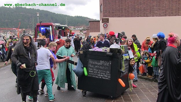 Mit dabei waren wieder viele Vereine und Gruppen aus Hirschhorn, Eberbach und der gesamten Region. Acht Musikgruppen sorgten für die passenden Rhythmen und Mitsing-Melodien. Unter den Themen, die in teils aufwändigen Motivwagen dargestellt wurden, waren die Windkraftdiskussion und der VW-Abgasskandal. Von einigen Regentropfen ließen sich die Narren und Tausende Zuschauer am Zugweg die gute Laune nicht verderben.