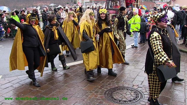 Mit dabei waren wieder viele Vereine und Gruppen aus Hirschhorn, Eberbach und der gesamten Region. Acht Musikgruppen sorgten für die passenden Rhythmen und Mitsing-Melodien. Unter den Themen, die in teils aufwändigen Motivwagen dargestellt wurden, waren die Windkraftdiskussion und der VW-Abgasskandal. Von einigen Regentropfen ließen sich die Narren und Tausende Zuschauer am Zugweg die gute Laune nicht verderben.