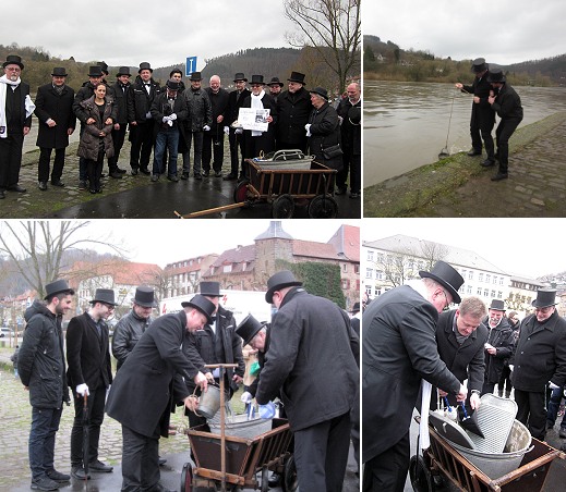 Anschließend wurde Neckarwasser geschöpft und in den mitgebrachten Bottich gefüllt. So wurde neben leeren Geldbeuteln der Teilnehmer auch ein leeres „Schwarzgeld-Schwein“ und die leere Stadtkasse mit Neckarwasser ausgewaschen und mit Klobürsten geschrubbt, auf dass sie im nächsten Jahr vollgefüllt sein werden.