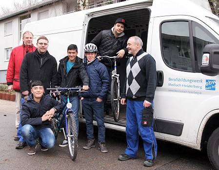 Berufsbildungswerk-Azubis setzten Fahrräder für junge Flüchtlinge instand Freude bei der Fahrrad-Übergabe von BBW-Azubis an junge Flüchtlinge aus Afghanistan: (v.l.) Ralf Geyer, Azubi Matthew (oben), Jumakhan, Mohammed Ali, Khodadad, Azubi Marcel und Rolf Hanstein. (Foto: Dirk Adler-Witkowski)(bro) (mw) Anderen Jugendlichen ein Mehr an Normalität bieten - dieser Aufgabe stellten sich jetzt angehende Fahrradmonteure vom Berufsbildungswerk (BBW) Mosbach-Heidelberg der Johannes-Diakonie. Die Auszubildenden am Standort Heidelberg setzten für junge Flüchtlinge aus Afghanistan gespendete Fahrräder instand und übergaben sie auf dem Schwarzacher Hof. Dort betreut die Johannes-Diakonie derzeit 16 unbegleitete minderjährige Ausländer.