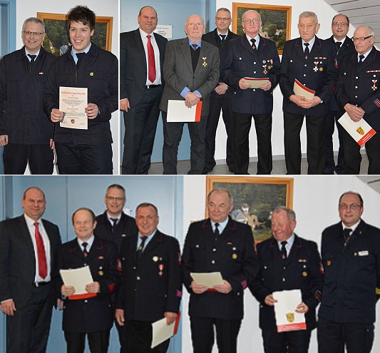 Folgende Personen wurden geehrt: Ehrenzeichen des BFV in Gold für 50 Jahre Mitgliedschaft: Reinhard Haas, Erich Schäfer, Edgar Scheuermann, Dieter Haas, (nicht anwesend: Harald Hörr), Ehrenzeichen des BFV in Gold am Bande für 60 Jahre: Theo Beisel, Wilfried Holschuh, Ernst Siefert, Reinhold Holschuh, (nicht anwesend Reinhold Siefert und Georg Rexroth), Brandschutzehrenzeichen in Silber für 25 Jahre aktiv: Matthias Krieger, Alexander Mucha, Helmut Siefert jun., Andreas Uhrig (nicht anwesend Herbert Wagner), Brandschutz Ehrenzeichen in Gold für 40 Jahre aktiv: Ewald Johe, Heinz Kabel (nicht anwesend Wolfgang Schäfer). Anerkennungsprämie: Silvia Johe (für 10 Jahre), Ralf Rahn (für 30 Jahre), Ewald Johe, Heinz Kabel und Manfred Uhrig (für 40 Jahre). Florian Fülöp wurde zum Brandmeister befördert.