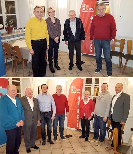 Hauptversammlung des SPD-Ortsvereins Eberbach  Oben: Die anwesenden Geehrten mit dem Vorsitzenden Rolf Schieck: Wilhelm Kukla, Jutta Veith und Dieter Zäpfel (v.l.). Unten: Die neue Vorstandschaft: Peter Nähr, Klaus Eiermann, Jan-Peter Röderer, Rolf Schieck, Christa Wernz, Jens Müller und Alexander Silbereis (aus der Vorstandschaft ausgeschieden) (v.l.). (Fotos: privat)(bro) (ph) Am vergangenen Freitag fand die die Hauptversammlung des SPD-Ortsvereins Eberbach statt. Der erste Vorsitzende Rolf Schieck begrüßte die anwesenden Mitglieder, darunter alle Gemeinderatsmitglieder der SPD-Fraktion.