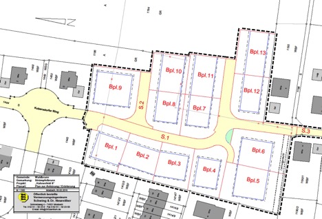 Baugebiete eröffnen Entwicklungsmöglichkeiten Im Baugebiet Hahnenfeld II in Strümpfelbrunn sollen 13 Bauplätze erschlossen werden. Fünf davon sind bereits reserviert, für zwei weitere gibt es laut Bürgermeister Markus Haas ebenfalls Interessenten. (Grafik: Schwing&Dr. Neureither/Repro: Hofherr)(hof) Wilhelmstraße, Hahnenfeld II und Leimengrube III eröffnen Entwicklungsmöglichkeiten für Ortsteile – Baumängel Katzenbuckel-Therme – Gemeinde schließt Vergleich mit Planer und Baufirma