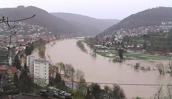 Der Neckar hat sich in Eberbach breit gemacht (Foto:Richter)(hr) Die Pumpen in zahlreichen Kellern der Innenstadt laufen auf Hochtouren. Der Neckar ist wieder einmal zu einem gewaltigen Strom angeschwollen und weit über seine Ufer getreten. Nachdem bereits gestern am späten Abend die Uferstraße (B 37) und die Wilhelm-Blos-Straße (L 2311) teilweise gesperrt werden mussten, kletterte der Pegelstand heute im Laufe des Tages stetig weiter. Wer mit dem Auto durch die Stadt will, muss bisweilen lange Staus und Wartezeiten in Kauf nehmen. Heute abend hat sich der Wasserstand bei 7,55 Metern am Pegel Eberbach eingependelt und ist mittlerweile wieder leicht rückläufig. Damit handelt es sich um das größte Hochwasser seit April 1994.