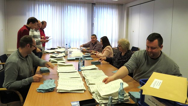 Grüne auch am Neckar vorne - Rechtspopulisten stärker als im Landesschnitt Stimmenauszählung im Eberbacher Rathaus. (Foto: Claudia Richter)(hr) Auch die Eberbacher Wähler haben bei der heutigen Landtagswahl die Grünen zur stärksten politischen Kraft gemacht. Das Wahlergebnis zeigt aber auch, dass die Rechtspopulisten kräftigen Zulauf hatten.