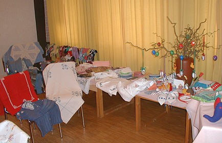 Katholische Frauen bastelten wieder für wohltätige Zwecke Ein Teil der kunstvoll hergestellten Handarbeiten. (Foto:Richter)(hr) Heute fand wieder der Osterverkauf des Handarbeitskreises der Katholischen Frauengemeinschaft im Pfarrheim in der Feuergrabengasse statt. Wie in jedem Jahr wurden von den etwa 10 Frauen auch diesmal wieder in mühevoller Kleinarbeit hergestellte Handarbeiten und Bastelarbeiten verkauft. Der Erlös aus diesem Verkauf und aus dem letzten Weihnachtsverkauf (wir berichteten) wird demnächjst wieder verschiedenen wohltätigen Zwecken zufließen.