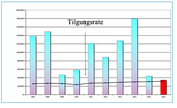 Großer Finanzbedarf wegen Daseinsvorsorge Entwicklung der Zuführungsraten zum Vermögenshaushalt in den Jahren 2007 bis 2016. (Repro: Hofherr)(hof) Gleich mit zwei nicht ganz einfachen Themenkomplexen musste sich am Montag der Waldbrunner Gemeinderat unter Vorsitz von Bürgermeister Markus Haas beschäftigen. Neben den Haushaltsberatungen, die nach Jahren der Konsolidierung und des konsequenten Schuldenabbaus erstmals wieder eine Neuverschuldung vorsah, war der Antrag auf der Windpark Markgrafen GbR auf Errichtung von 12 Windkraftanlagen auf den Gemarkungen der Stadt Eberbach (zwei Anlagen) und Waldbrunn (zehn Anlagen), der die Sitzung bestimmte.