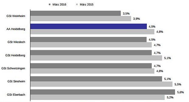Der Arbeitsmarkt zeigt sich robust gegenüber Konjunkturschwankungen Arbeitslosenquoten im März. (Grafik: Bundesagentur für Arbeit)(bro) (aa) Die Zahl der arbeitslosen Menschen im Heidelberger Agenturbezirk ist von Februar auf März um 167 auf 16.351 Personen gesunken. Gegenüber dem Vorjahresmonat ist die Arbeitslosigkeit um 720 niedriger. Die Arbeitslosenquote ist um 0,1 zurückgegangen und beträgt jetzt 4,5 Prozent.