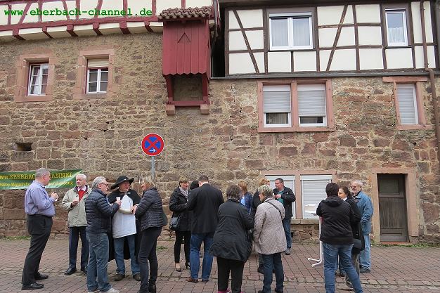So entwickelten sich auch gestern Nachmittag ab 16 Uhr interessante Unterhaltungen rund um das Thema “nette Toilette” in Eberbach. Im Fokus stand dabei der kleine Holzerker, der in vier Metern Höhe neben dem Torbogen zum Pfarrhof an der Stadtmauer hängt. Laut Schilderungen des Eberbacher “Nachtwächters” Eugen Emmig, der gestern im Dienstgewand dabei war, wurde der Bretterkasten nämlich früher tatsächlich als Toilette genutzt. Hauseigentümer Friedrich Seibert berichtete, dass der Erker um 1910 an das Haus gebaut worden sei. Eine Nutzung als Toilette bestätigte er zwar nicht, aber Emmigs Geschichte vom erhabenen Klohäuschen kommt zumindest auf seinen Stadtführungen bei den Gästen immer gut an. Der Nachtwächter erläuterte gestern den rund 60 Gästen auch gleich noch die sparsame Nutzung von Toilettenpapier nach der Ein-Blatt-Methode (unser Video). Emmig (Bild rechts) hatte eine rote Laterne mitgebracht, denn das sei gestern seine letzte Amtshandlung gewesen. Grund: die schlechte Bezahlung durch die Stadt Eberbach.