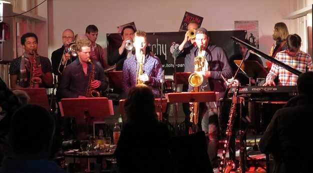 Erstes Wochenende mit vier musikalischen Events (Foto: Claudia Richter)(cr) Die Eberbacher Jazztage 2016 haben gestern begonnen. Bei der ersten Veranstaltung im Club 55 begeisterte die zwölfköpfige Band “Itchy Pants” (unser Bild) mit einem rund zweistündigen Programm.